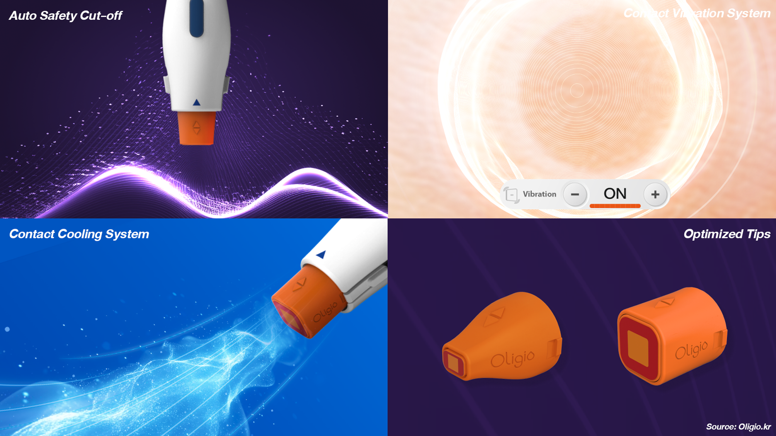This image is from https://oligio.kr/, showing the key features of the Oligio device.